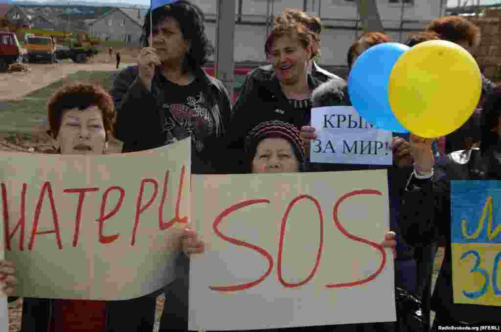 Несколько сотен женщин с крымскотатарского массива Строгановка на окраине Симферополя в четверг провели акцию за мир и против пребывания российских войск в Крыму.
