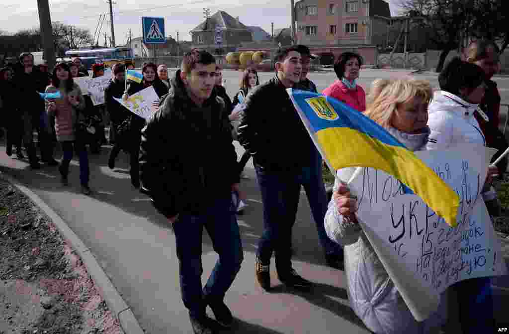 Проукраинские демонстранты во время антивоенной демонстрации у памятника Тарасу Шевченко в Симферополе, 7 марта 2014