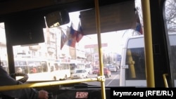 В разгар «крымской весны» самым востребованным атрибутом в Крыму стал российский флаг. Он «украшал» лобовое стекло чуть ли не каждой второй машины. Сейчас с триколорами ездят единицы. Но встречаются и особо преданные патриоты. Водитель симферопольской маршрутки прицепил на стекло сразу 5 российских флажков.