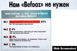 Например, на сайте http://c-pravda.ru/ этот материал подан в виде более приемлемом для социологического опроса. Он имеет «объективный» заголовок: «Нужен ли Крыму фестиваль «Befooz»?», в то время как в газете он представлен в форме безапелляционного утверждения: «Нам «Befooz» не нужен». В то же время сайт полностью разоблачает и несостоятельность опроса – из 2-х с лишним миллионов жителей Крыма на вопрос газеты ответили… всего 30 человек! Более того, данные на сайте и в газете разнятся. Если на сайте в четверг вечером, то есть в момент подписания газеты в печать, и когда ее интернет-вариант уже вывешивается на сайте, и когда интернет-голосование уже должно быть закрытым, а, значит, должно оставаться неизменным и соответствовать тому, которое пошло в газету, он выглядит вот так: