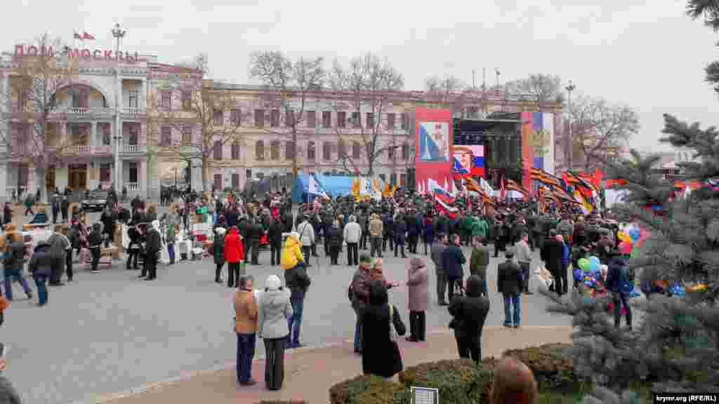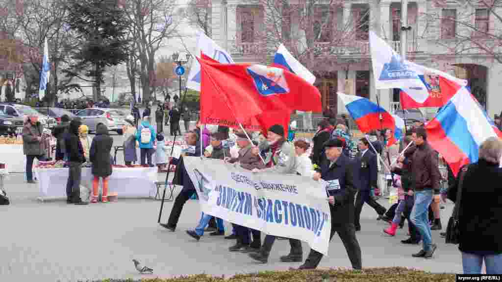 В Севастополе 18 марта, на центральной площади Нахимова, прошел митинг, посвященный второй годовщине российской аннексии Крыма. В мероприятии приняли участие представители молодежной организации партии «Справедливая Россия», партии «Единая Россия», а также представители местных и российских казачьих организаций.