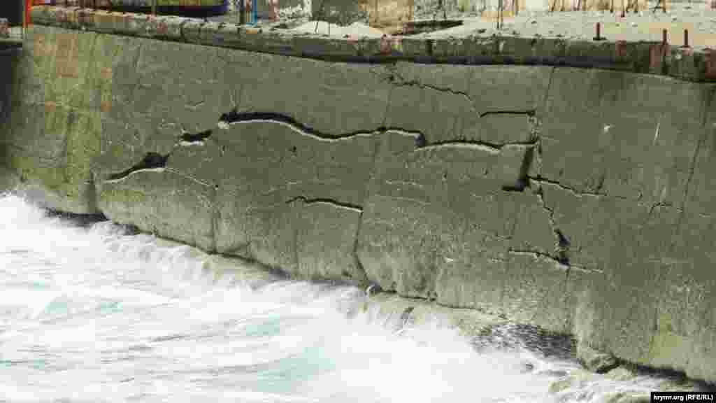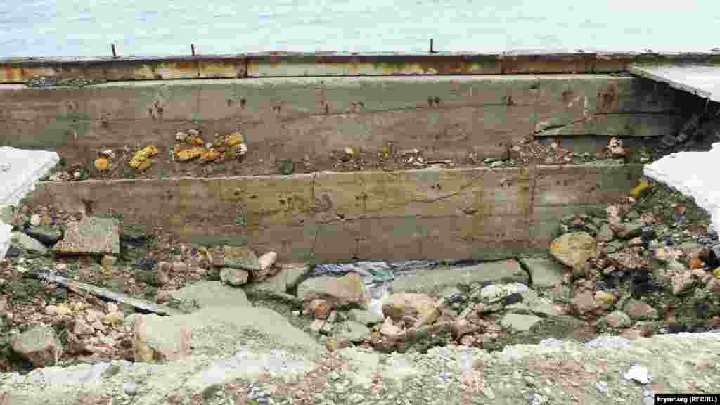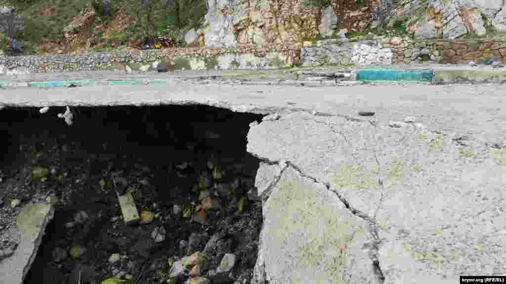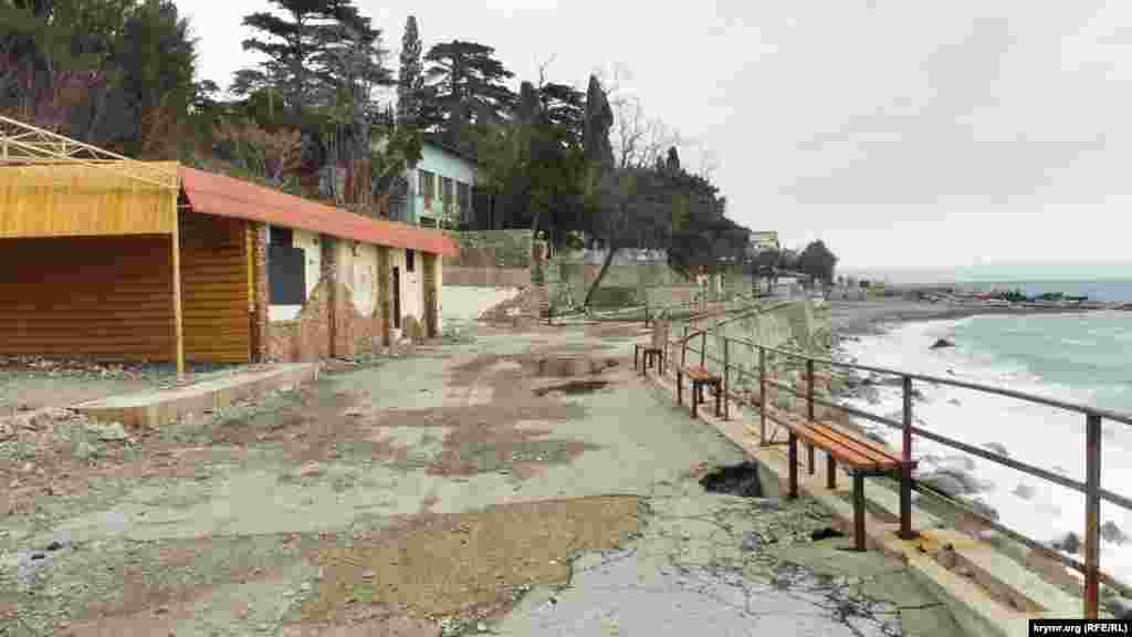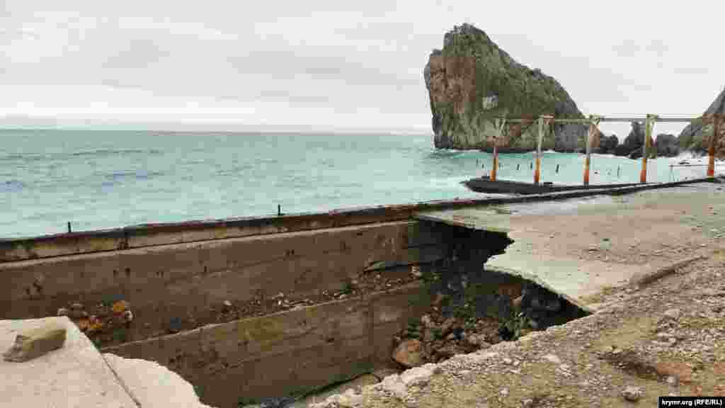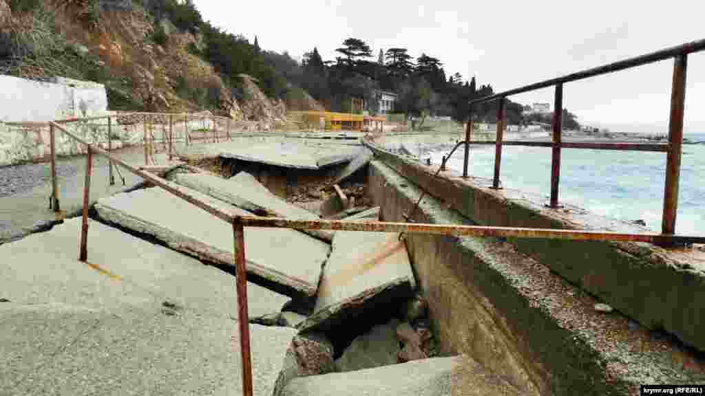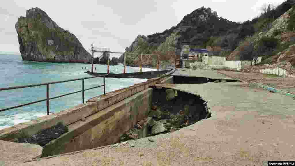 Сломанные железные перекрытия бывших кафе, дыры в асфальте, глубиной в три и более метров, канавы и груды камней на пляже – все, что осталось от набережной в крымском поселке Симеиз. Первый обвал здесь произошел осенью 2015 года. В апреле 2016 подконтрольный России глава Крыма Сергей Аксенов заявлял, что из бюджета республики будет выделено 20 миллионов рублей на ликвидацию провала. Однако работы так и не начались. Нынешней зимой состояние набережной ухудшилось. Теперь она стала опасна для жизни.