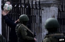Женщина передает еду украинским военным под присмотром российских, 18 марта 2014 года