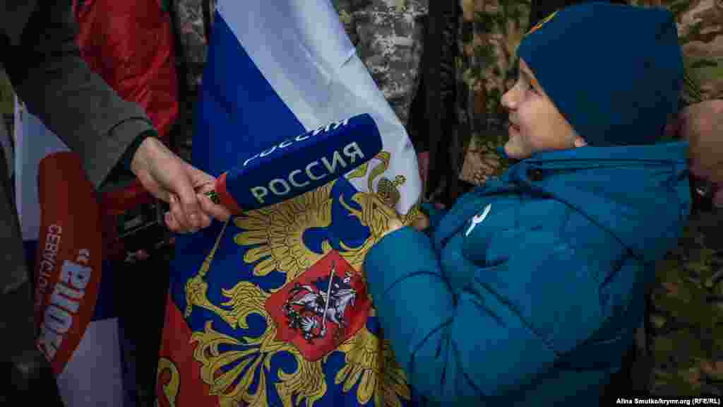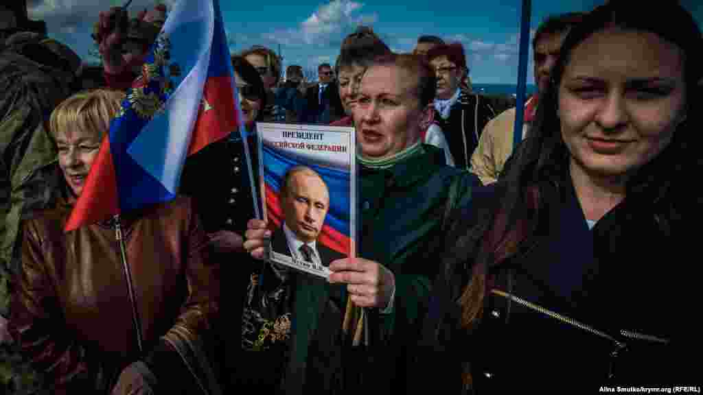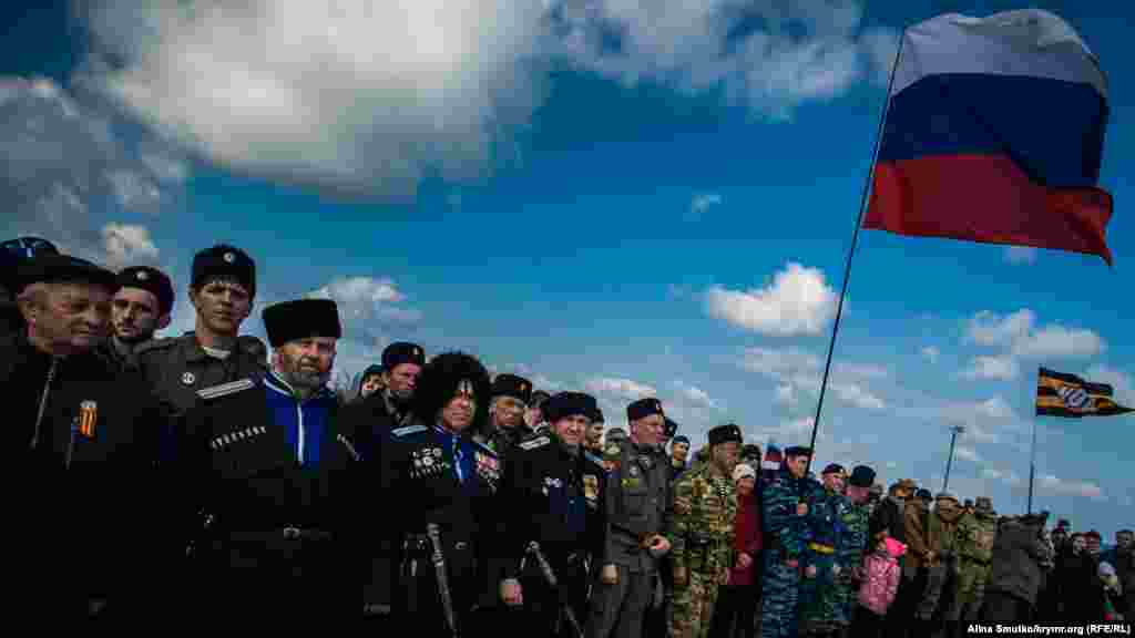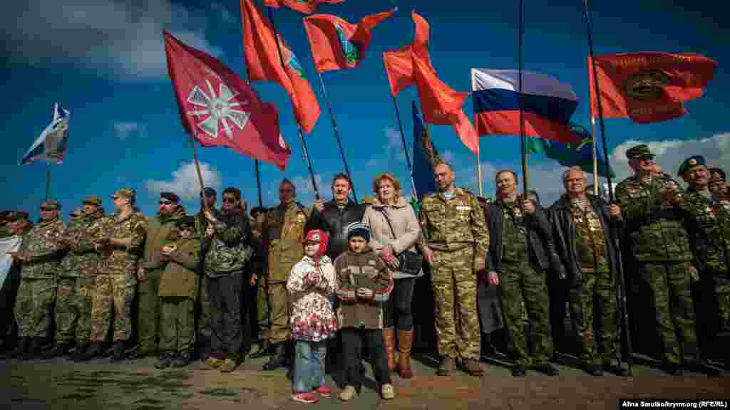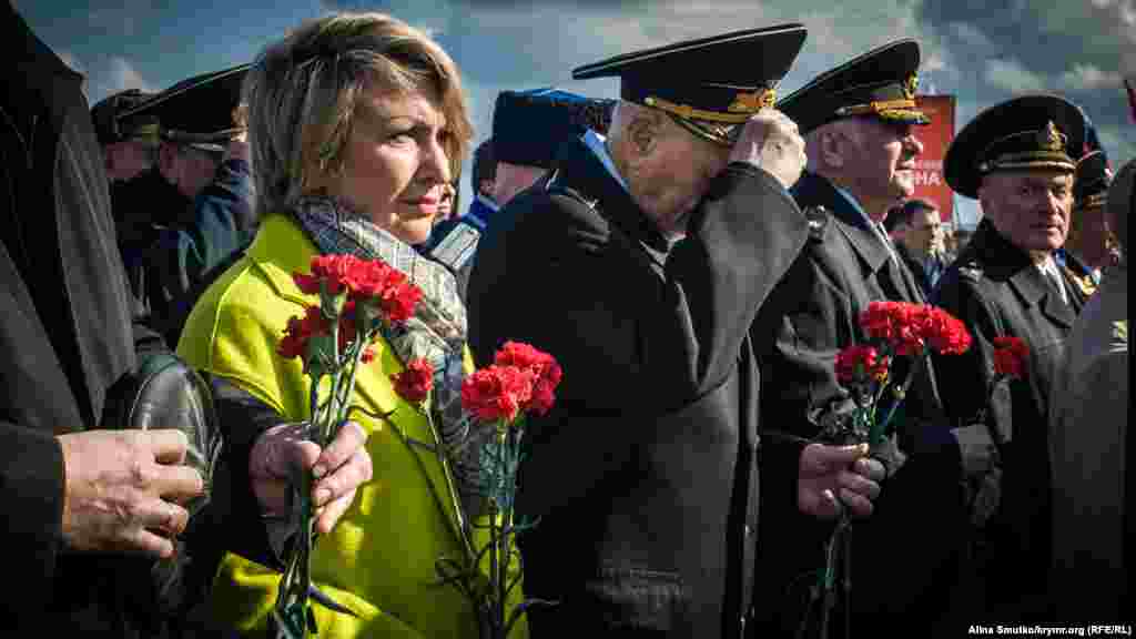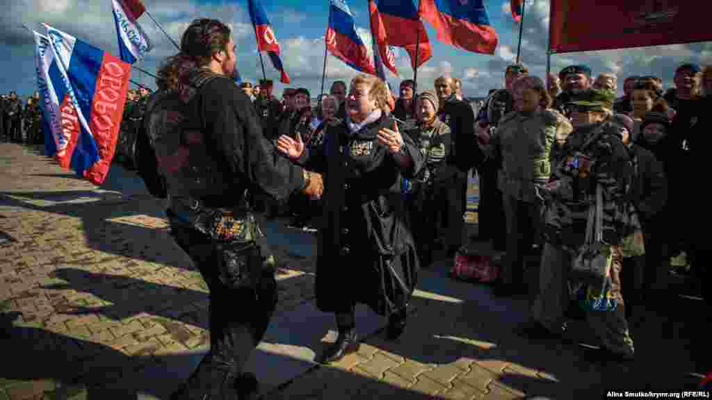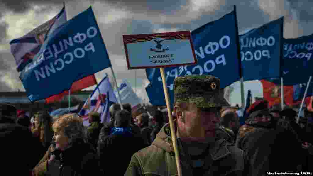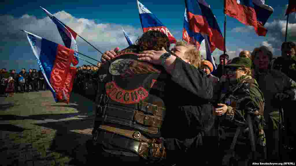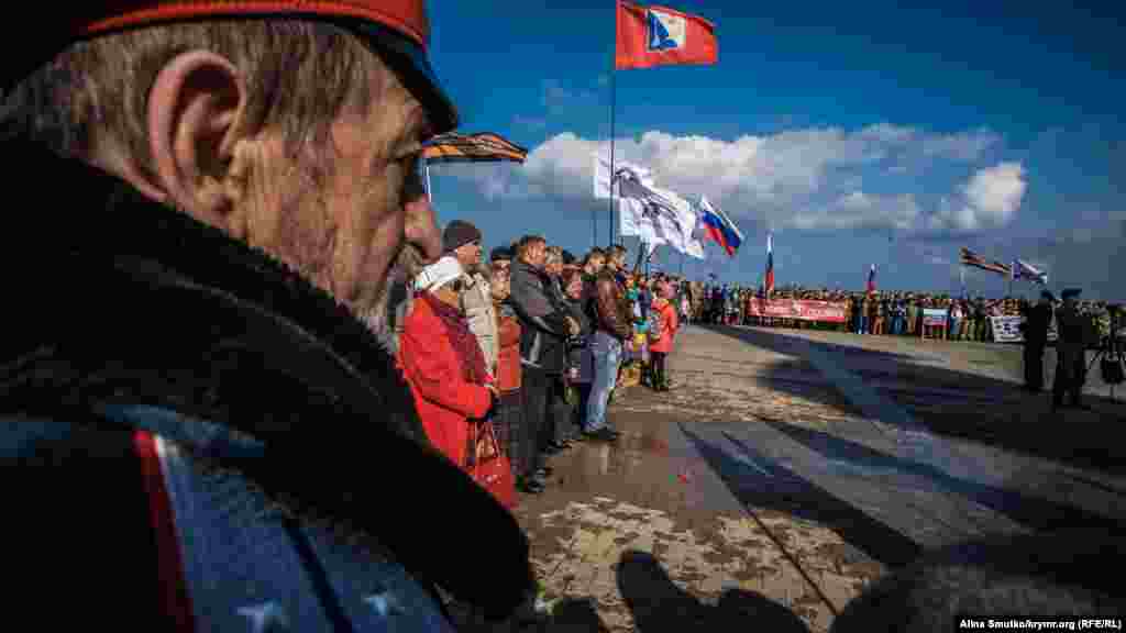 Возле памятника «Солдат и Матрос» в Севастополе прошел митинг, посвященный третьей годовщине «присоединения» Крыма к России. На мероприятии присутствовали местные чиновники, депутаты Госдумы РФ, члены Совета Федерации, а также лидер «путинских» байкеров Александр «Хирург» Залдостанов.