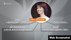 «На Елену Аксенову на тот момент, к 2010-м году, было записано около десятка компаний. Одна из них занималась овощехранением, около двух или трех фирм – это строительство, как было указано в уставных документах, ну и большая часть фирм занималась арендой, субарендой», – вспоминает журналист-расследователь из Крыма Татьяна Курманова.