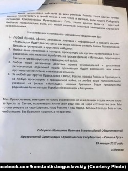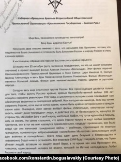 Первая волна писем от "Христианского государства" стала приходить в российские кинотеатры еще в январе – до того, как премьера "Матильды" была перенесена на осень. "Если выйдет фильм "Матильда", кинотеатры начнут гореть, может даже пострадают люди, и действия эти, от безвыходности, начнутся со стороны тех, кто Любит Бога и свой народ. Официально уведомляем: любой баннер, афиша, листовка с информацией о прокате фильма будет рассмотрена как желание унизить святых православной церкви и провокация к "русскому майдану", – говорилось в послании. Новое письмо, которое датировано июлем, начало приходить в кинотеатры в августе. Оно объемнее, занимает целых 5 страниц и содержит, в частности, такую фразу (орфография и пунктуация оригинала):
