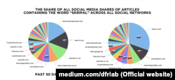 «Данные Buzzsumo за последние 30 дней показывают, что доля привлечения социальных сетей изданий RT и Sputnik значительно увеличилась на прошлой неделе и сейчас составляет около 65%. Это значит, что между 28 марта и 4 апреля две из трех статей об отравлении Скрипаля, распространенные в Facebook, Twitter, LinkedIn или Pinterest, происходят из информационных агентств, финансируемых Кремлем», ‒ говорится в исследовании.