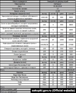 Один ужин в Ливадийском дворце для 12 человек обошелся в 109,3 тысячи рублей. Гостей кормили черноморской сельдью и скумбрией, салатами из филе барабули, розовой телятины и артишоков. На выбор гостям предоставили жареную камбалу, каре крымского ягненка с овощами гриль и оливки сицилийские и ассорти из чиабат. А на десерт – шоколадно-банановый торт и шоколадный брауни с ореховым ликером.
