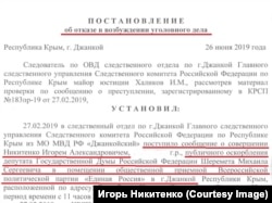 Постановление об отказе в возбуждении уголовного дела подписано следователем Джанкойского следственного отдела Следкома России Ильшатом Халиковым. В документе, копией которого располагают Крым.Реалии, говорится, что Михаил Шеремет заявил о публичном оскорблении, угрозах убийством и причинении тяжкого вреда его здоровью. Правда, как именно пострадало его здоровье, не известно до сих пор, поскольку депутат, в отличие от Игоря Никитенко, не обнародовал никаких медицинских справок или других доказательств.