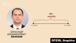 - Александр Малахов: 771 жалоба за период с конца 2014 до 2020 года, то есть в среднем – почти 130 жалоб в год – в течение половины десятилетия.