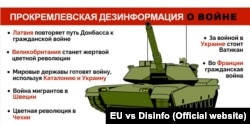 «На этой неделе «гастрольные представления», посвященные гражданской войне, переехали на северо-восток, и мы услышали то же самое срочное сообщение о балтийских странах: теперь это Латвия, которая, пожалуй, «присоединилась» к европейским странам в ведении внутренней войны. Украина ‒ единственная из стран стала мишенью российской дезинформации, где на самом деле идет война. И, в отличие от нарратива прокремлевской дезинформации, это не гражданская война, а война, спровоцированная и поддерживаемая самой Россией», ‒ говорится в свежем обзоре дезинформации.