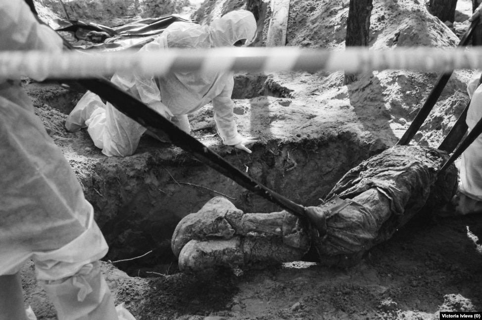 Адрес кладбища – улица Шекспира. Каждый день на кладбище на улице Шекспира сотрудники ДСНС (МЧС) в кипенно-белых, сверкающих на солнце одеждах достают из могил тела своих сограждан, погибших за время российской оккупации.