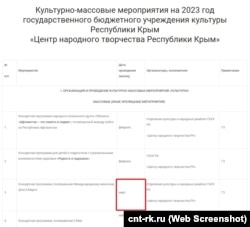 Как выяснили Крым.Реалии, в этом документе день 18 марта обозначен лаконично: «Торжественное мероприятие, посвященное Дню Общекрымского референдума 2014 года и Дню воссоединения Крыма с Россией». Концертных программ на эту дату в плане не предусмотрено, хотя в предыдущие годы они там присутствовали.