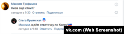 «Ждём ответочку по Киеву!» – отвечает ему пользовательница под ником Ольга Крымская.