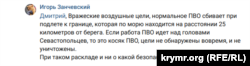В эффективности российской противовоздушной обороны сильно сомневается Игорь Заинчевский: «Вражеские воздушные цели нормальная ПВО сбивает при подлете к границе, которая по морю находится на расстоянии 25 километров от берега. Если работа ПВО идет над головами севастопольцев, то это косяк ПВО, цели не обнаружены вовремя и не уничтожены. При таком раскладе и ни о какой безопасности не может быть и речи».