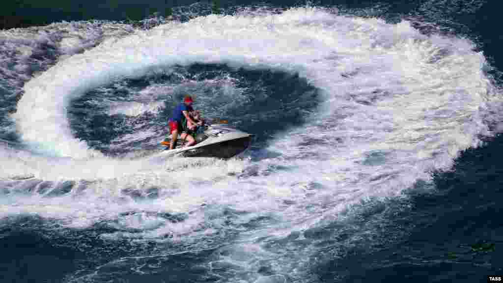 Мужчина и женщина «волнуют море», катаясь на гидроцикле у скалы Дива в поселке Симеиз.