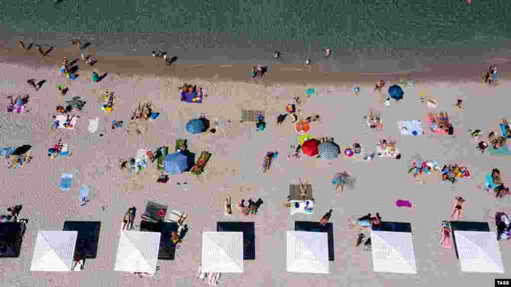 У береговой линии на пляже в Оленевке, что на мысе Тарханкут, под жарким крымским солнцем загорают отдыхающие.