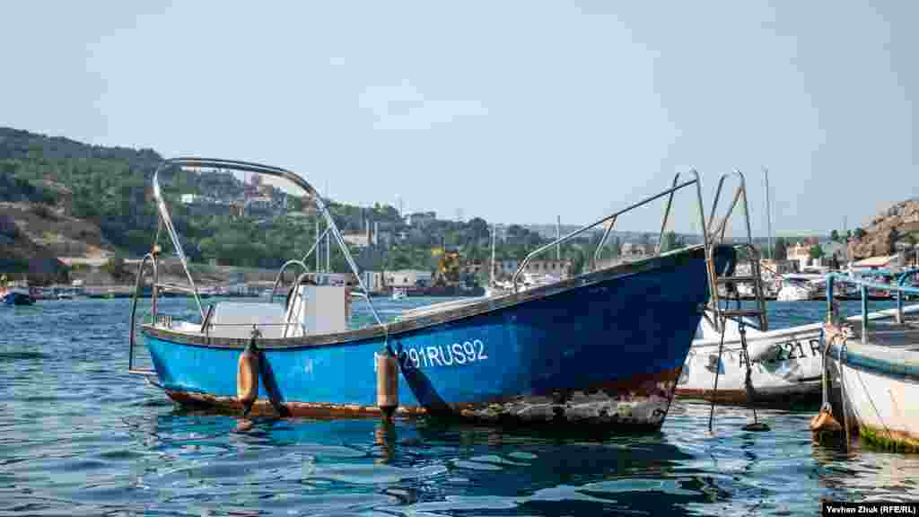 У пирса в Балаклавской бухте пришвартована прогулочная лодка.
