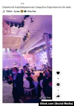 В тиктоке Лидии есть и другие указания на тесное общение семьи Слуцкого с кланом азербайджанских горских евреев. 6 июня этого года дочь Слуцкого выложила видео из богато украшенного банкетного зала ТЦ "Европейский", подписанное "Еврейской-Азербайджанская Свадьба в Европейском би лайк" (орфография сохранена).