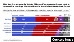 Это вызвало предположения, что его жена, Мишель, готовится к борьбе за номинацию. Опрос, проведенный компанией Ipsos в начале месяца, когда уход Байдена стал казаться более вероятным, показал, что из всех возможных кандидатов только Мишель Обама может победить Трампа.