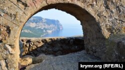 Остатки обоих мощных укреплений уцелели и после Второй мировой, несмотря на то, что после войны сооружения использовались как полигон для испытания авиабомб. Прогуляться к форту Южный – приятное и познавательное путешествие. Путь начинается с горы Крепостной, от развалин Генуэзской крепости Чембало. На фото – здания бывшей метеостанции, а между ними тропа, которая идет по оврагу Шайтан-Дере.
