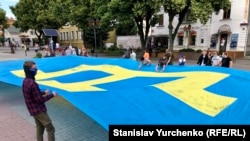 Как сообщает корреспондент Крым.Реалии, к акции, которая прошла на Европейской площади, присоединилось несколько десятков людей.