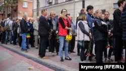 Тысячи людей приходят на центральную площадь Керчи, где в пятницу 19 октября происходит церемония прощания с жертвами массового убийства в политехническом колледже.