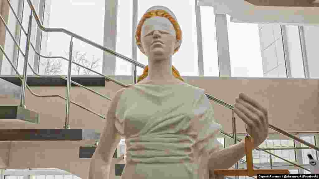 Джанкой, 20 марта. Статуя Фемиды, греческой богини правосудия, в подконтрольном России Джанкойском районном суде. 20 марта российский глава Крыма Сергей Аксенов открыл здание суда в Джанкое после капремонта.