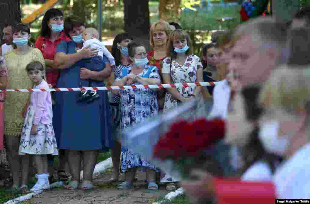 Симферопольский район. Село Константиновка. Родители учащихся наблюдают за приуроченной ко Дню знаний линейкой в местной школе. От торжества их отделяет красно-белая заградительная лента – необходимое условие в связи с пандемией COVID-19 в Крыму.