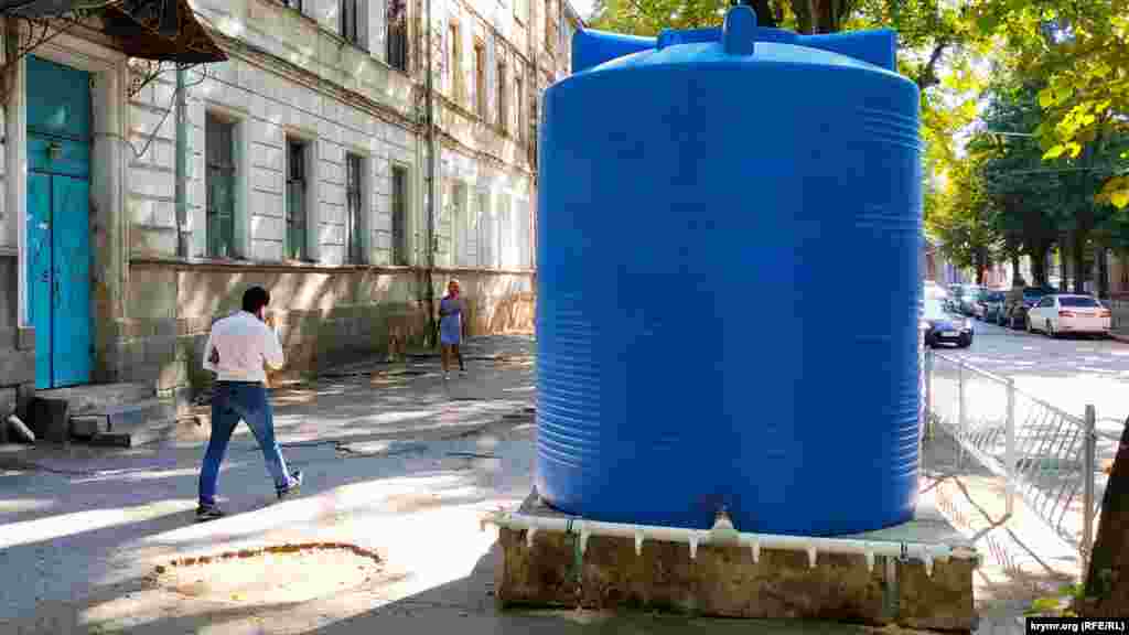 Вот такие резервуары для воды появились на улицах Симферополя и Симферопольского района. Конкретно этот стоит в центре крымской столицы – на пересечении улиц Самокиша и Жуковского. Пока резервуары пустуют, однако в скором времени их начнут наполнять водой. Все из-за новый ограничений в водснабжении – со 2 сентября подача воды в самых проблемных регионах полуострова будет осуществляться по графику. Запасаться водой можно будет и из таких резервуаров, однако российские власти Крыма просят жителей обязательно кипятить воду из них перед употреблением.