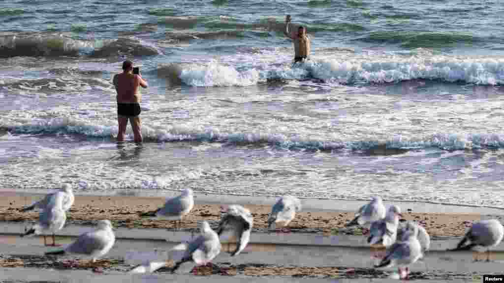 Мужчины решили искупаться в Черном море в начале ноября. Температура воды у побережья Евпатории находится на отметке 16 °C.