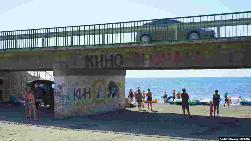 Муралы с Цоем под мостом видно на сельском пляже издалека