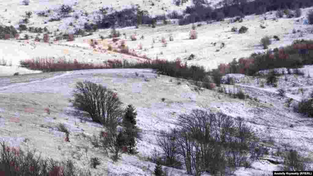 Нынче же толщина снежного покрова на северных отрогах Чатыр-Дага не превышает 3-4 сантиметров. Снег лишь прикрыл склоны и растительность. И все же на сером фоне долин заснеженные отроги величественного Чатыр-Дага смотрятся завораживающее и сказочно.