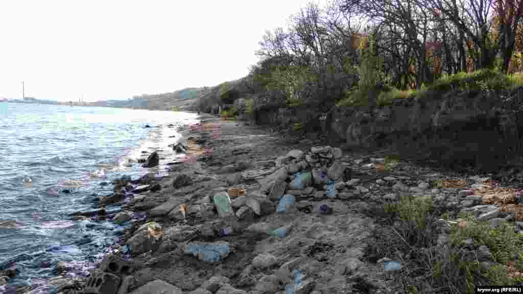 На пляже разрушена опорная стена из местного ракушечника, защищавшая береговую линию от оползней. Каменная кладка рухнула на пляж, на песке и в кромке прибоя лежат груды камней.