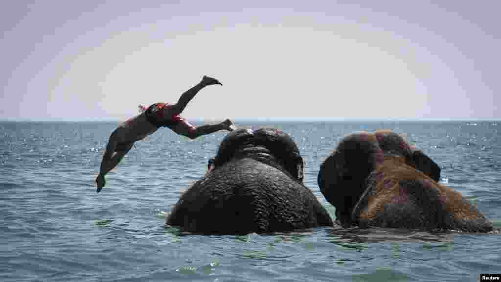 Необычные туристы в Евпатории: слоны купаются в море (фотогалерея)