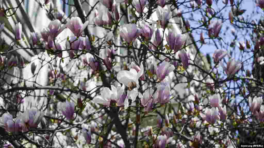 В Ялте, несмотря на пришедшее похолодание, зацвели деревья магнолии суланжа. В отличие от магнолии крупноцветковой, которая цветет в середине лета, суланжа зацветают первыми в середине весны.