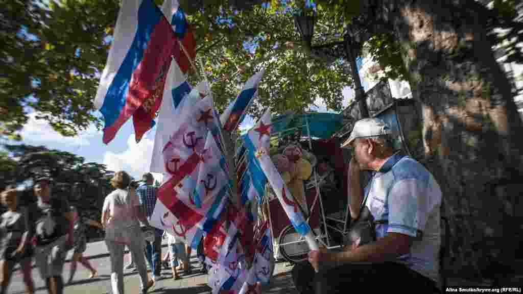 Севастополец с флагом военно-морского флота СССР и в футболке с изображением Путина