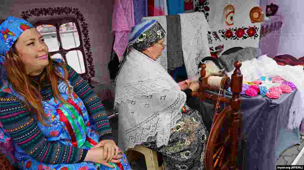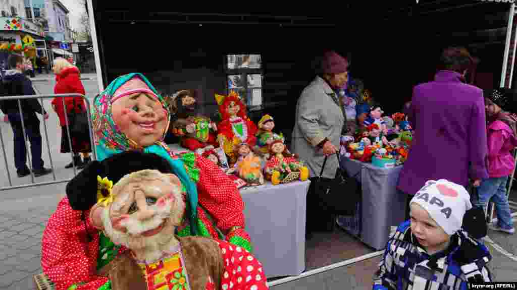 На площади Ленина в Симферополе в честь «годовщины референдума» устроили ярмарку: развернули торговые палатки с сувенирной продукцией и патриотической символикой. Детей развлекали аниматоры: показывали им авиамодели и мотоциклы.