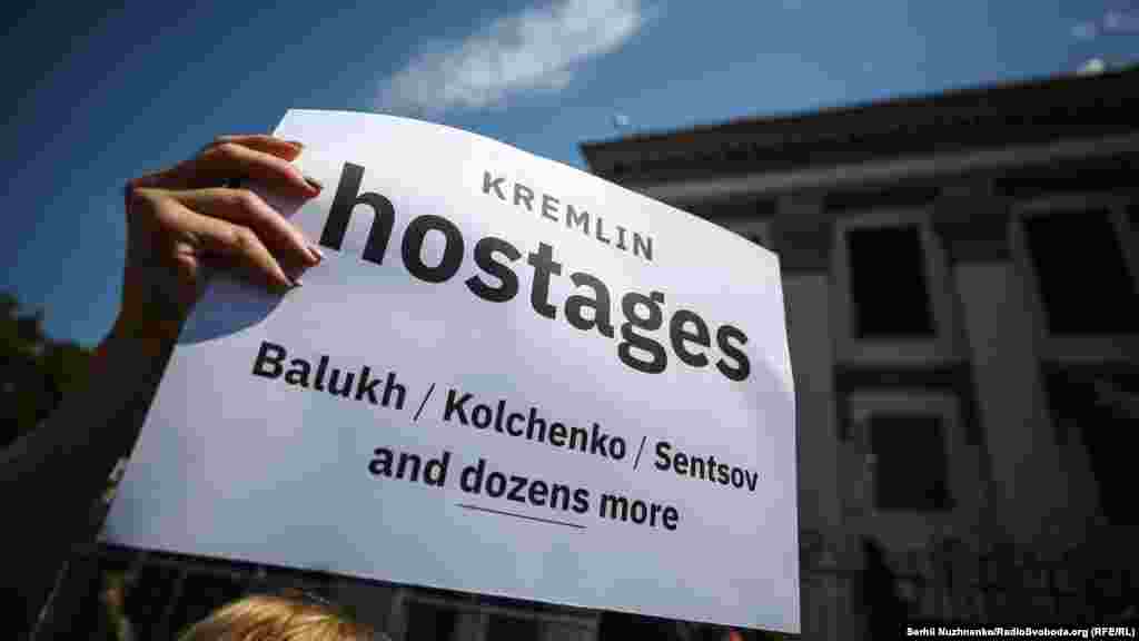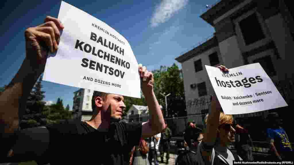 В Киеве у здания посольства России в Украине 24 мая прошла акция в поддержку украинского политзаключенного Олега Сенцова, который 14 мая объявил голодовку, находясь в колонии российского города Лабытнанги.