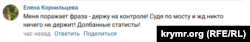 «Меня поражает фраза «Держу на контроле»! Судя по мосту и железной дороге, никто ничего не держит!» – пишет Елена Корнильцева, имея в виду сообщение Сергея Аксенова, в котором есть упоминание о контроле над ситуацией.