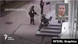 На одном из кадров с камер наблюдения военнослужащий российских вооруженных сил стоит у подъезда дома на улице Яблонской и держит в руках снайперскую винтовку "Винторез". Рядом с ним на лестнице сидит и говорит по рации сержант Борзунов. Идентифицировать военного с винтовкой пока не удалось: