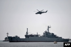 Российский вертолет Ми-24 пролетает над кораблем «Генерал Рябиков» в гавани Севастополя, 7 марта 2014 года